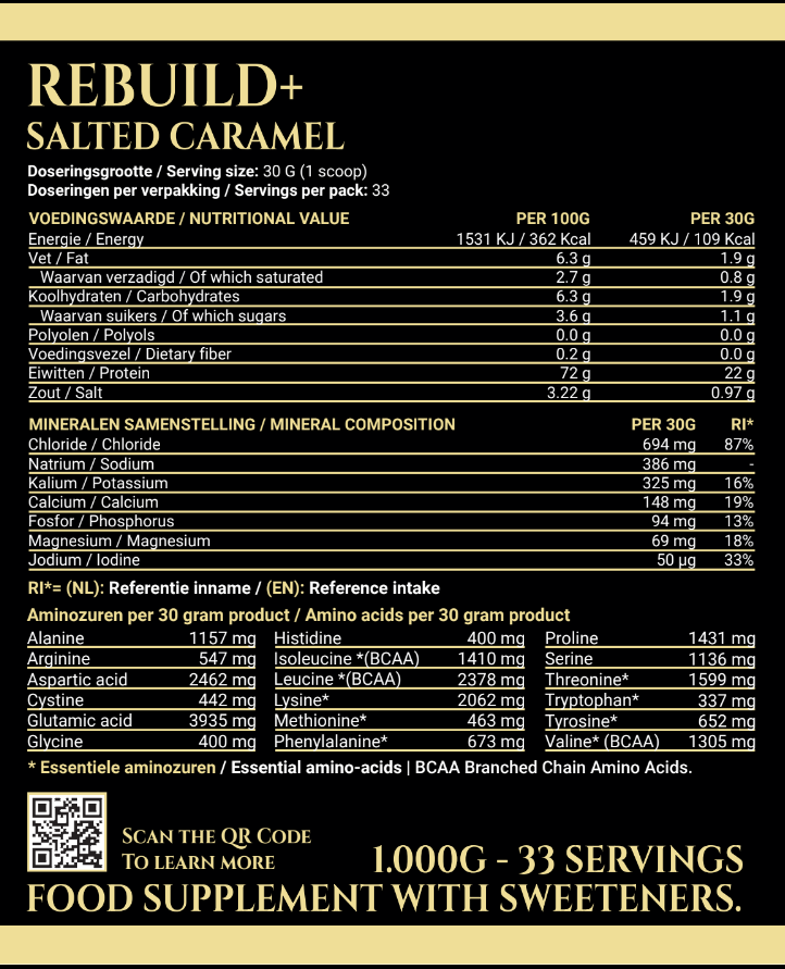 Met de toevoeging van kokoswaterpoeder biedt REBUILD+ extra ondersteuning bij het voorkomen van spierkrampen en het herstellen van je vochtbalans — ideaal na zware inspanning.